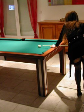 Красивая дева со спортивным телосложением приехала без одежды в бильярдный клуб к своему товарищу чтобы выполнить обещание и заняться с ним любовь. Войдя в зал, барышня захотела немного пошалить и начала показывать свою физическую подготовку, выставляя на показ свою голую киску принимая непристойные позы на бильярдном столе.