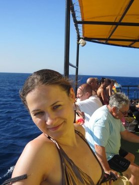 Не бедная потаскушка арендовала для себя дорого плавсредство и отправилась на нем в море. Плавая на яхте не скромная брюнетка решила, что может позволить себе отдыхать топлес и поэтому сняла верх купальника, оставшись в одних трусиках, что позволило ей полноценно проветрить неплохие дойки нулевого размера.