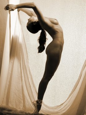 Прежде чем выйти на сцену, светловолосая краля с отличной внешностью закрылась в студии и сняла со своего тела все кроме балеток. Сексуальная балерина принимает разные позы не прикрывая интимные места и таким образом не только разминается перед выступление, но и показывая свою растяжку и красоту голеньких прелестей.