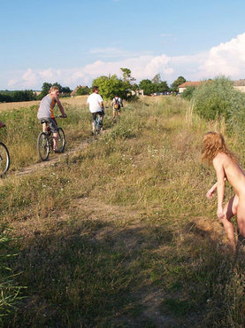 Голая дама сохнет у тропинки по которой проехали велосипедисты