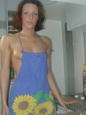 Телка возиться на кухне в фартуке на голое тело