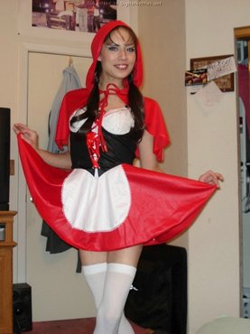 Брюнетка дома позирует в костюме красной шапочки